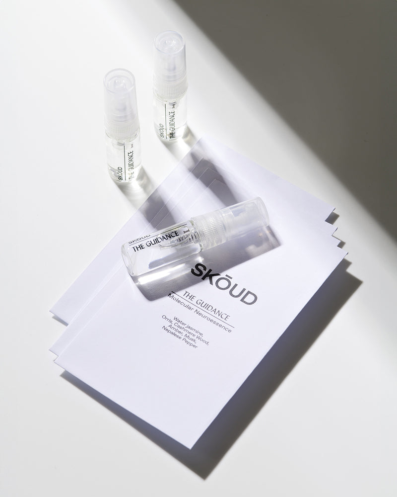 Die Produktinnovation The Guidance ist ein Hybrid aus einer neurologisch hochwirksamen Essenz und einem Molekülparfum. Die Duftnoten der schwerelosen Neuroessenz berühren die Haut wie eine sanfte, warme Umarmung und führen direkt ins Herz unberührter Natur. Wasserjasmin und Iriswurzel erzählen von frischem Meereswasser, während erdige Noten von Kaschmirholz, Amber und Moschus sanfte Wellen beschreiben, die über Treibholz ziehen.